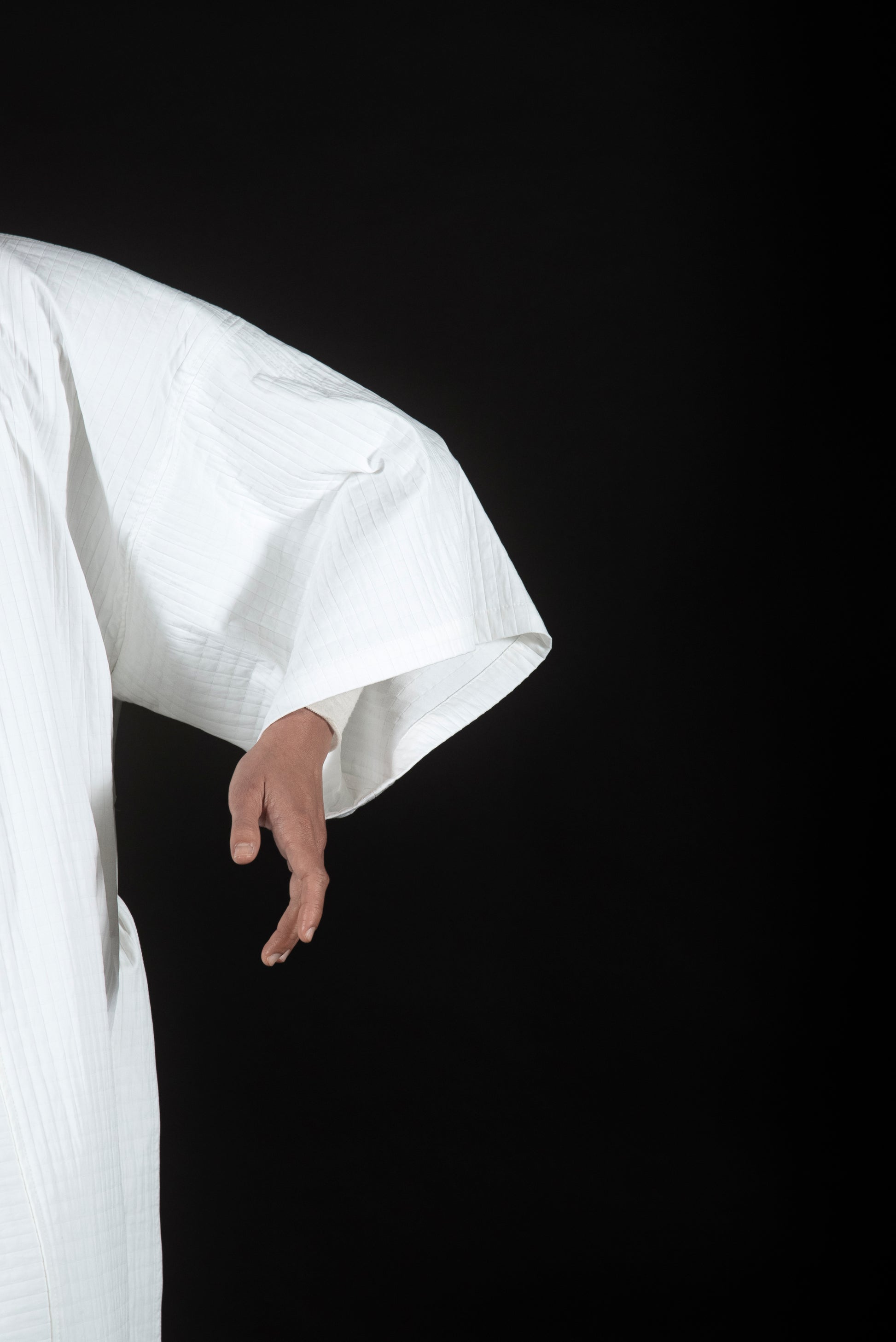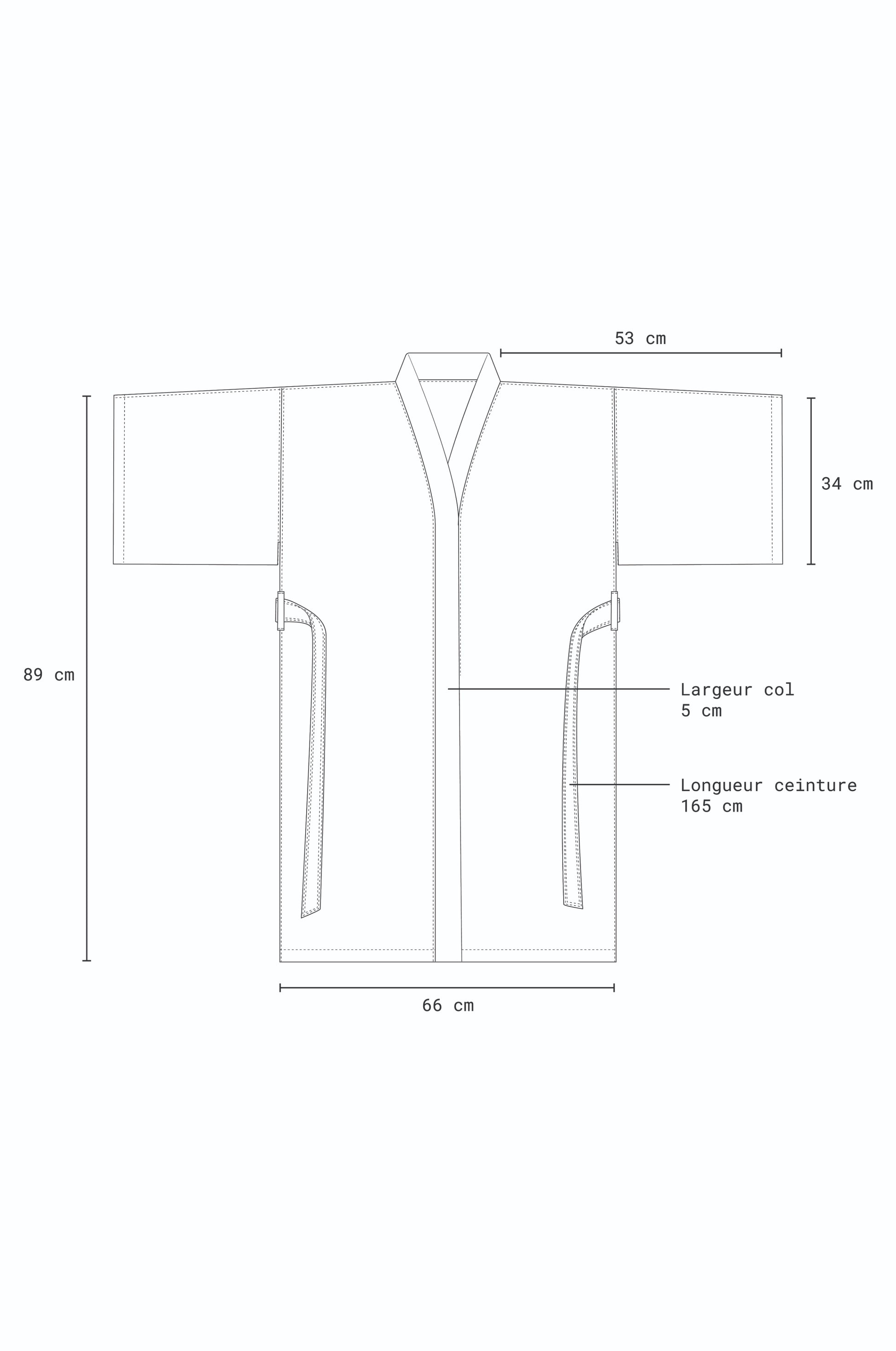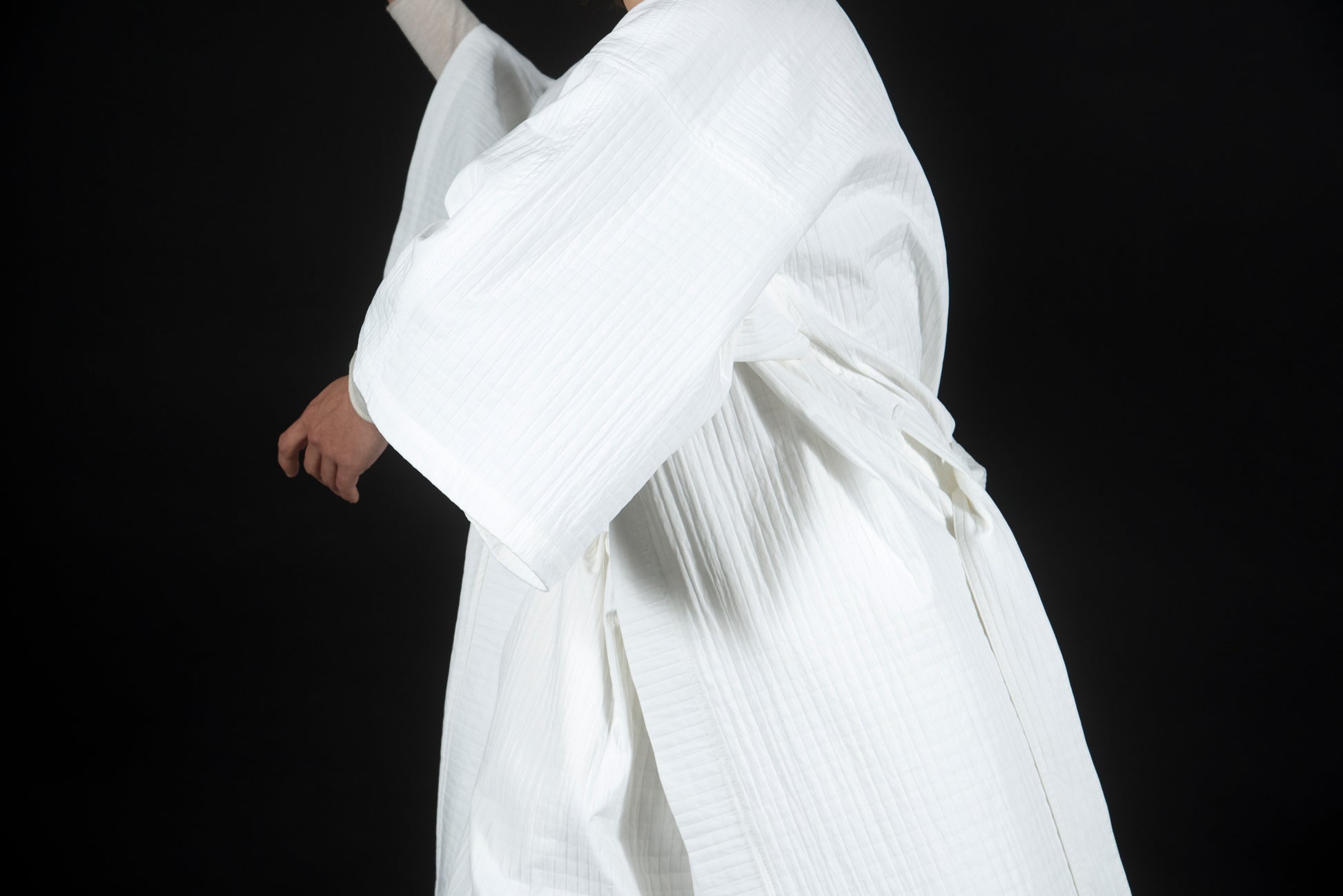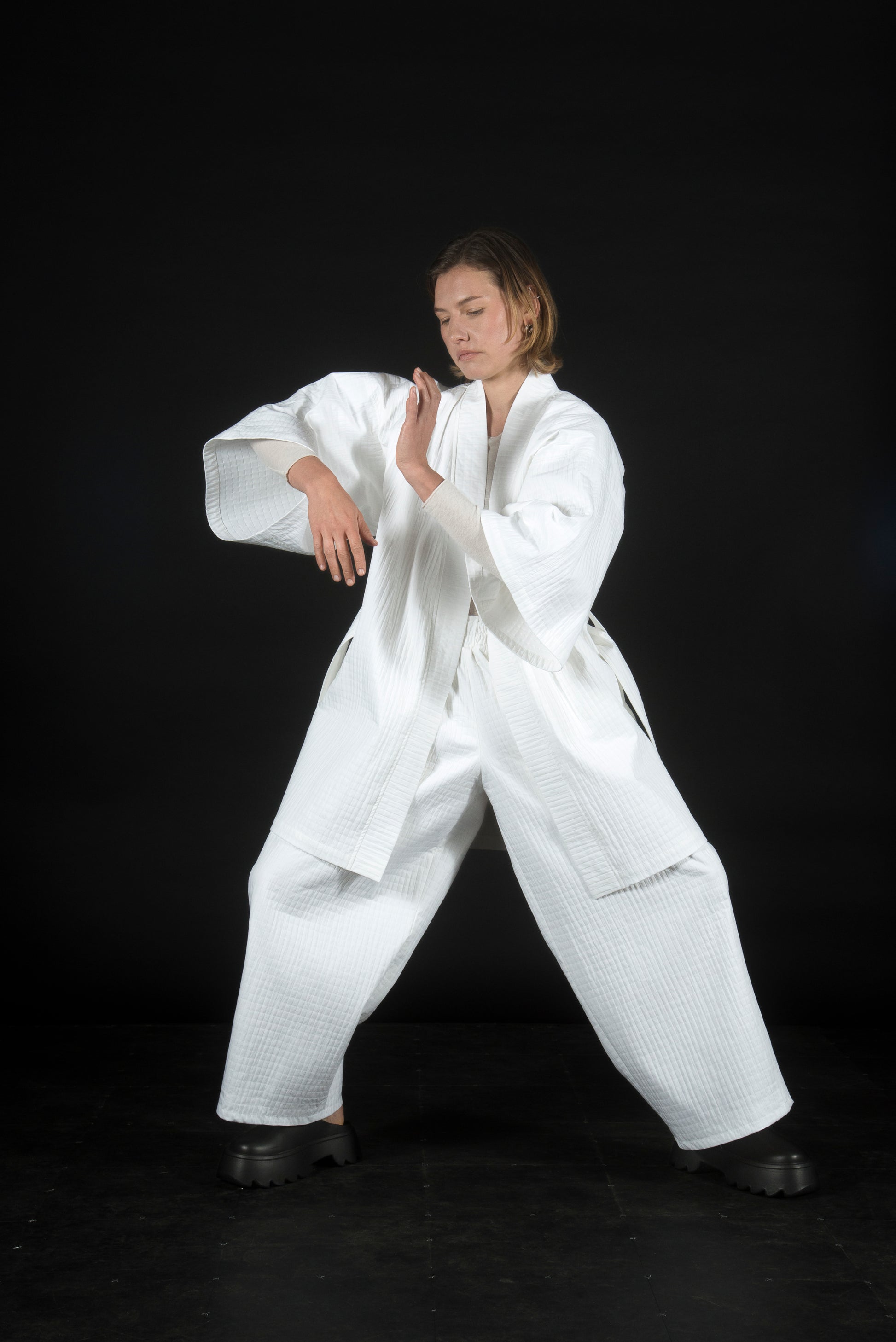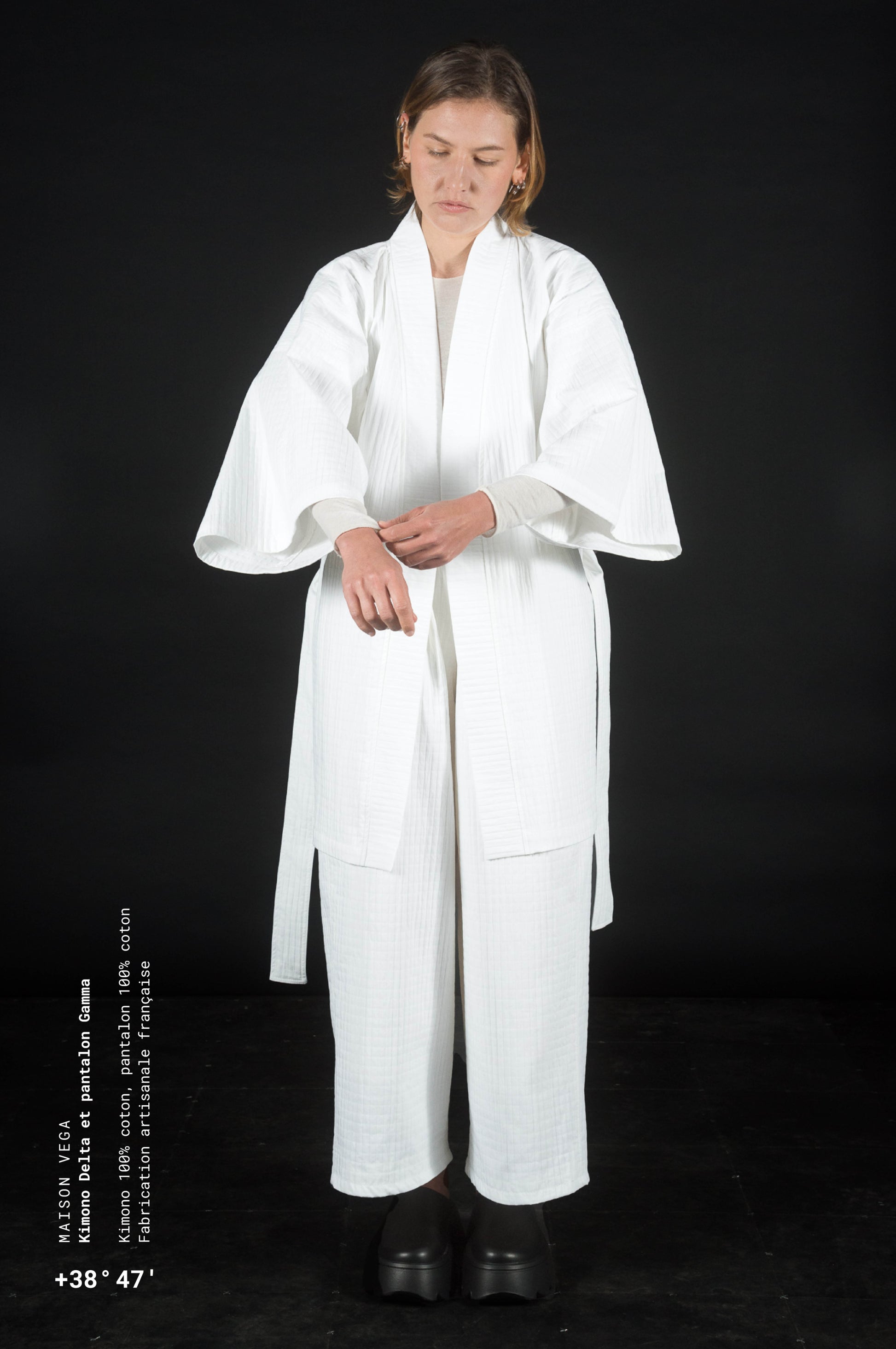 Le kimono Delta s’inspire des tenues d’arts-martiaux. Il est conçu dans un tissu de coton légèrement gaufré et assez rigide, ce qui lui donne beaucoup de tenue. C’est une pièce unisexe, qui peut se porter comme une veste, une sur-chemise ou une robe.