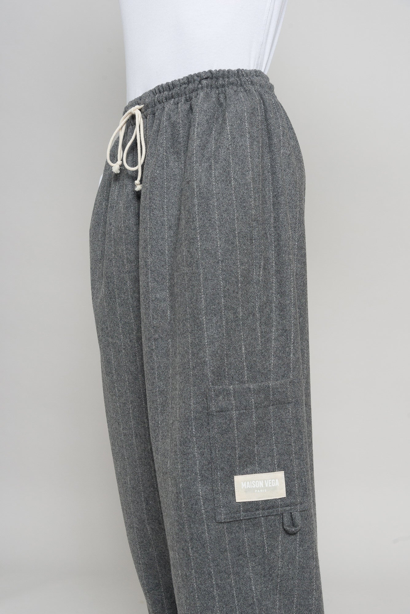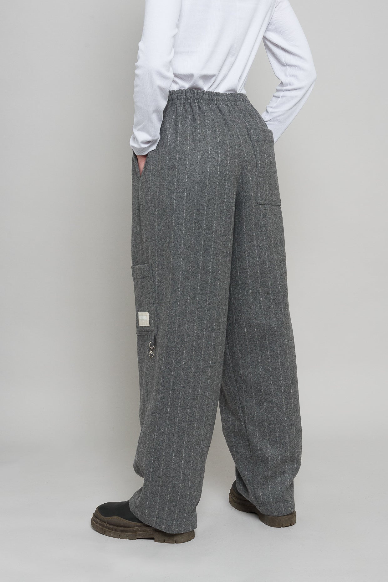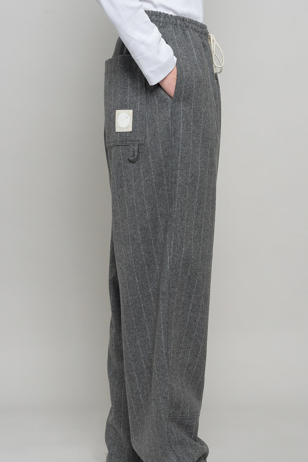 Le pantalon HALO s’inspire des tenues d’arts-martiaux. Nous avons légèrement affiné la coupe du bas par rapport à la coupe du pantalon DÜNE et ajouté une petite poche cargo sur le côté gauche pour un design un peu plus street. Il est conçu dans un lainage épais gris clair avec de fines rayures blanches.Deux poches coutures latérales et une poche plaquée sur l’arrière droit.