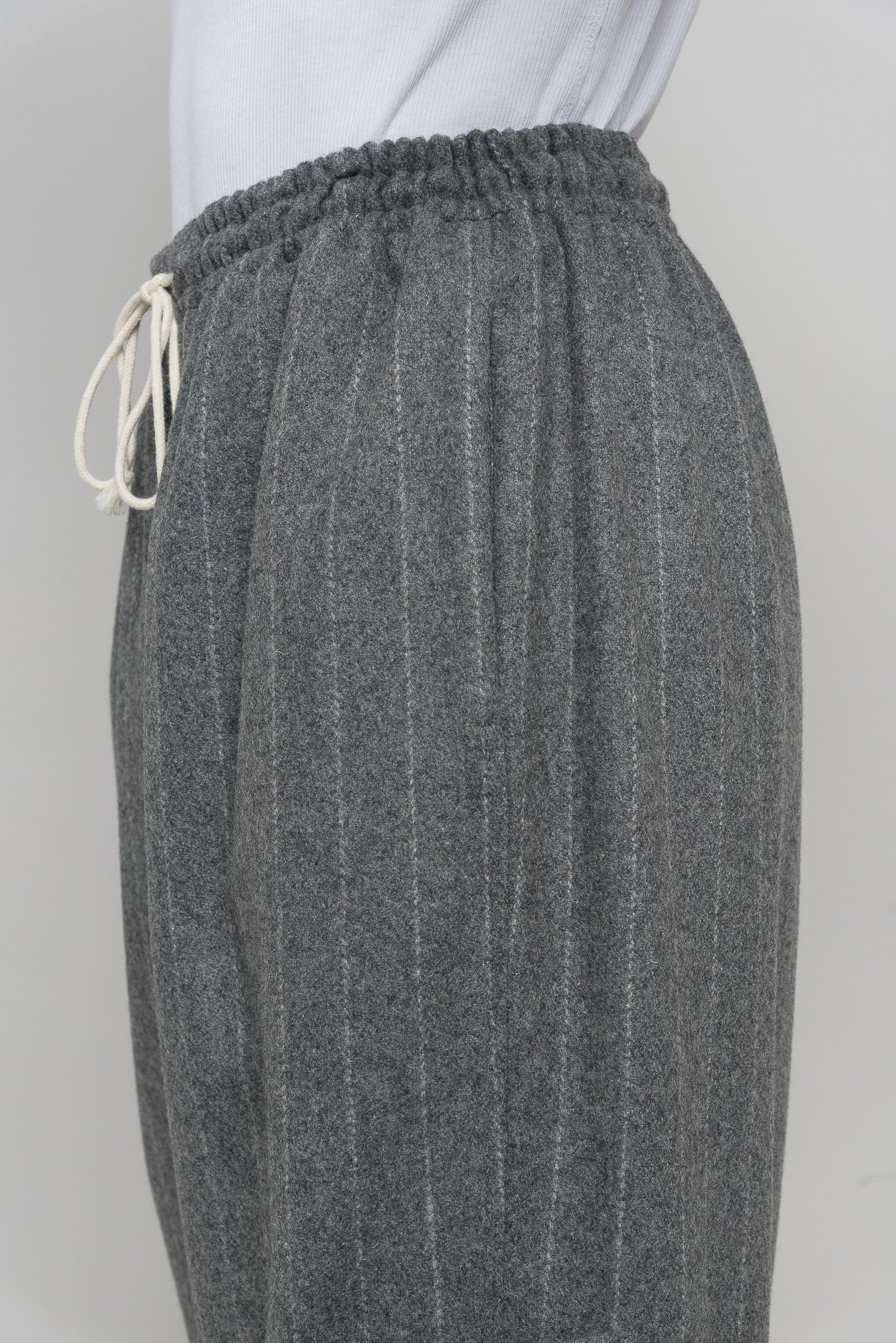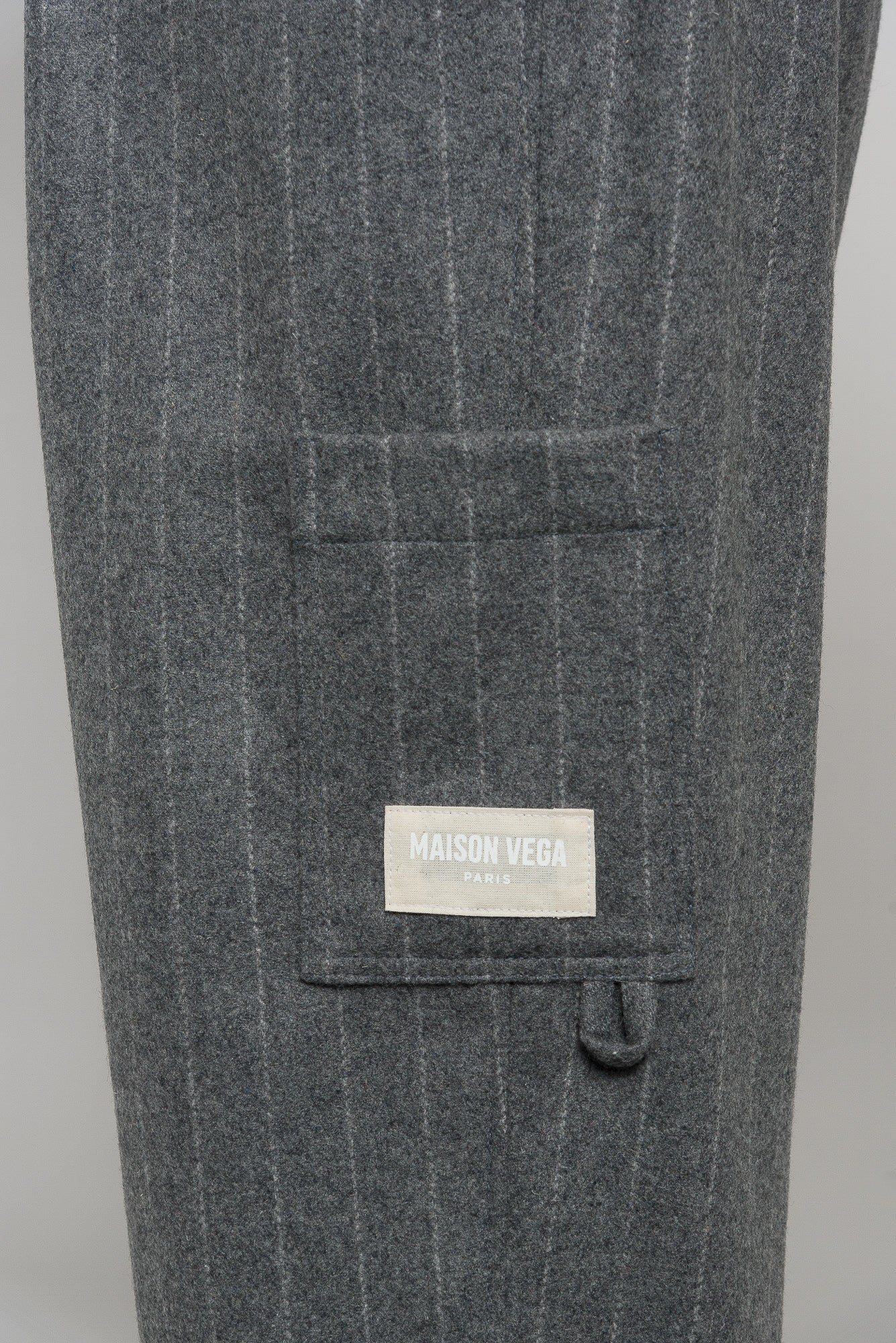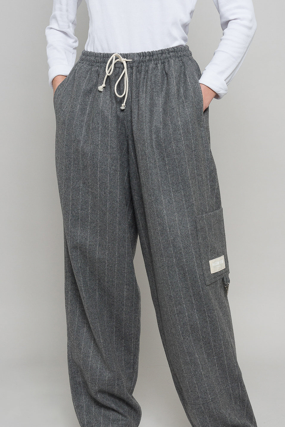 Le pantalon HALO s’inspire des tenues d’arts-martiaux. Nous avons légèrement affiné la coupe du bas par rapport à la coupe du pantalon DÜNE et ajouté une petite poche cargo sur le côté gauche pour un design un peu plus street. Il est conçu dans un lainage épais gris clair avec de fines rayures blanches.Deux poches coutures latérales et une poche plaquée sur l’arrière droit.