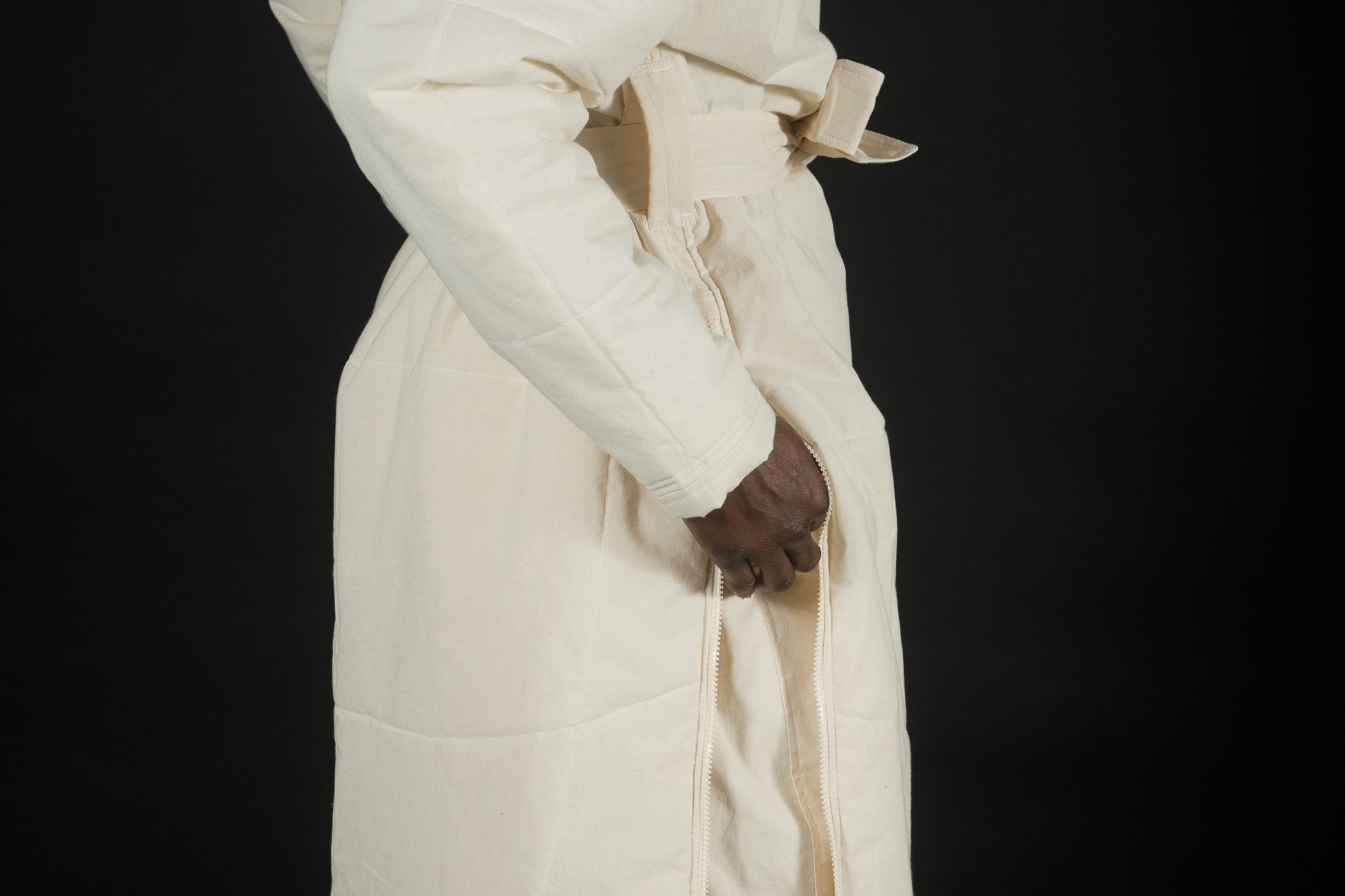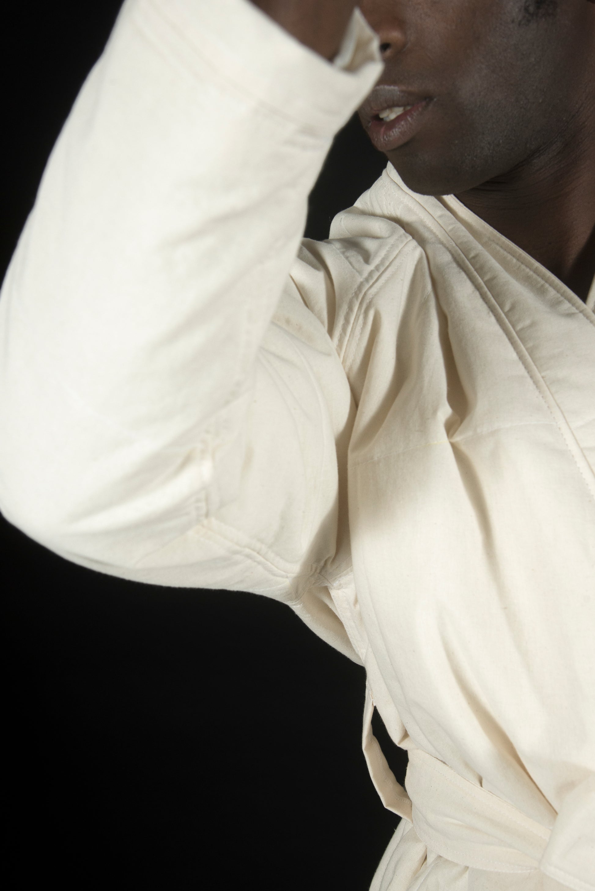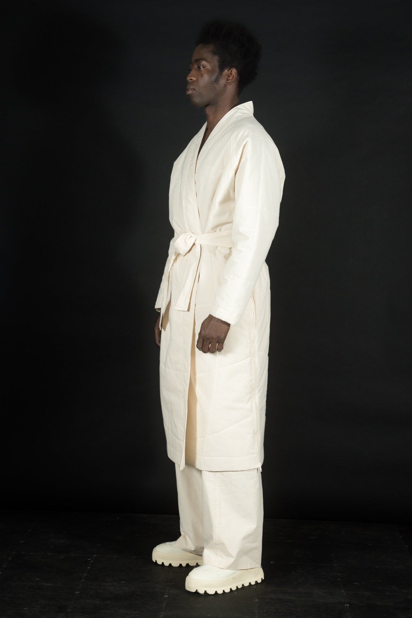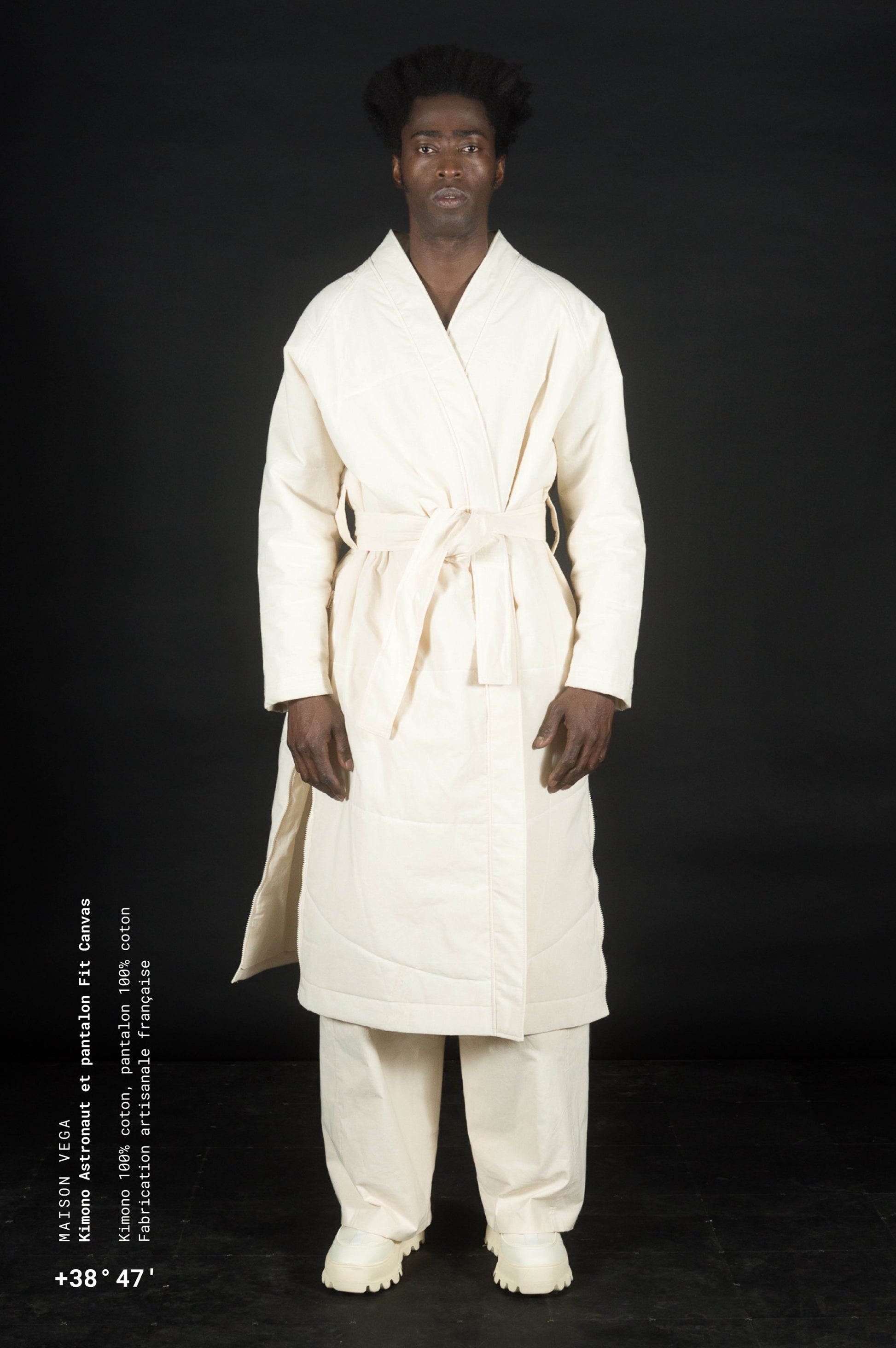 Ce Kimono s’inspire des combinaisons d'astronautes. Il est entièrement matelassé et doublé à la main en toile de coton. Les lignes de matelassage représentent les axes verticaux et horizontaux de la planète Terre. Il possède une ceinture qui peut se nouer de différentes manières. Des zips sur les côtés lui confèrent une grande amplitude de mouvements et permettent de glisser les mains dans les poches d’un pantalon. Les manches sont doublées en satin pour un enfilage agréable.