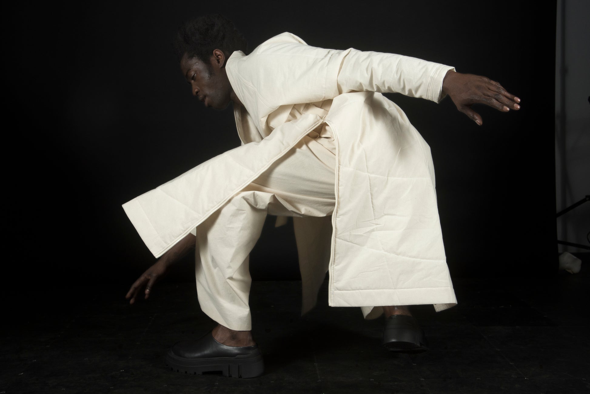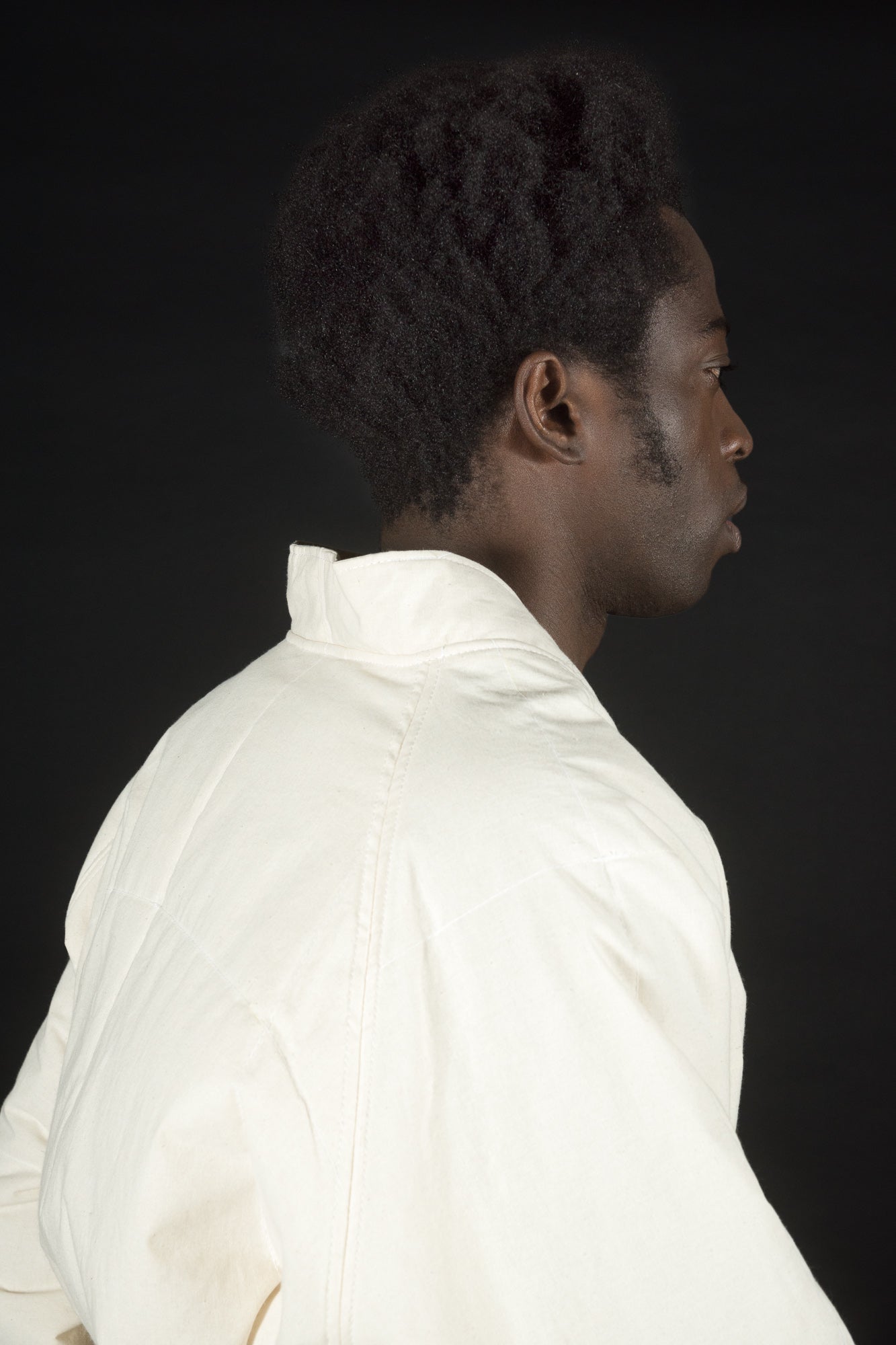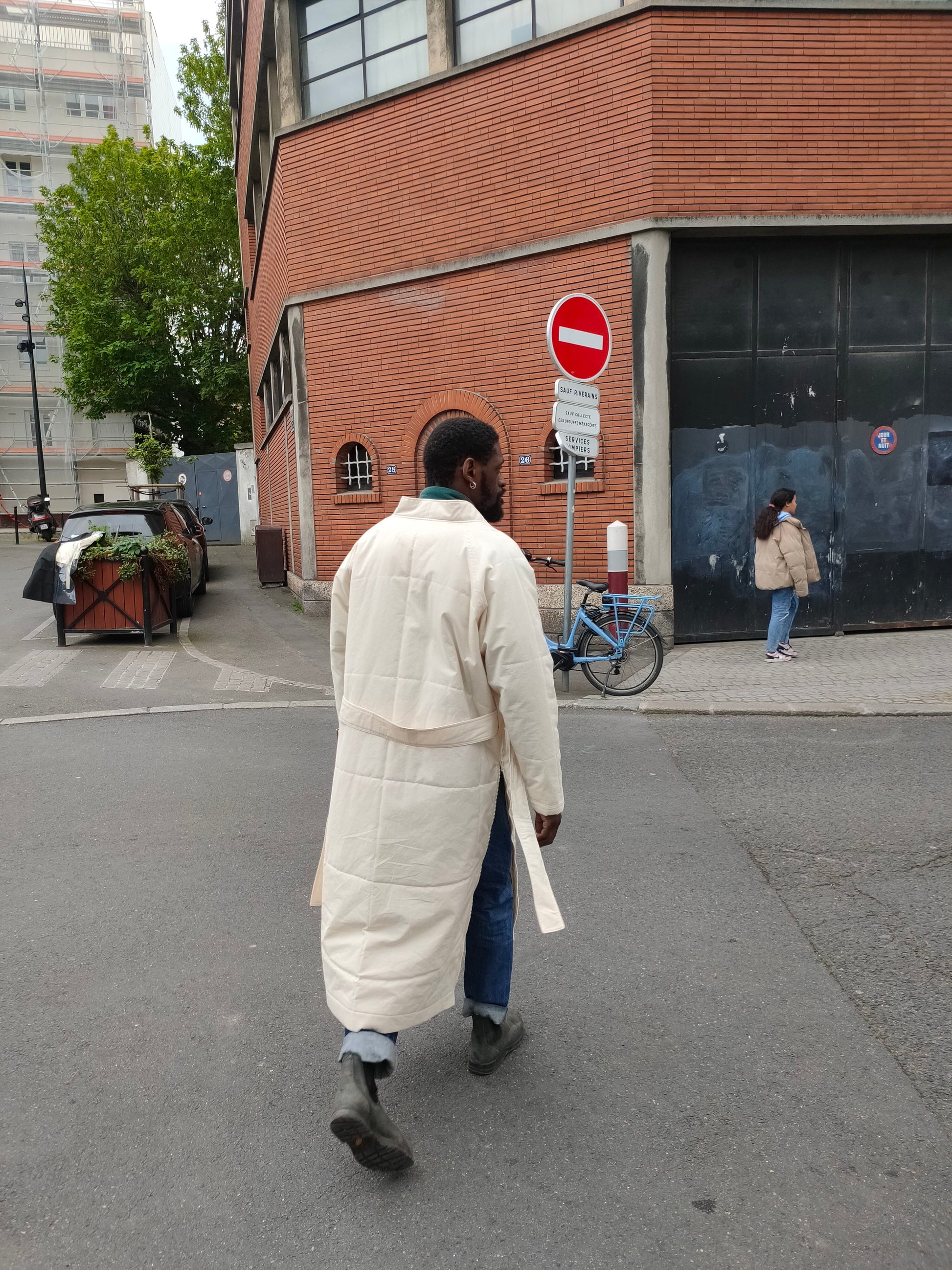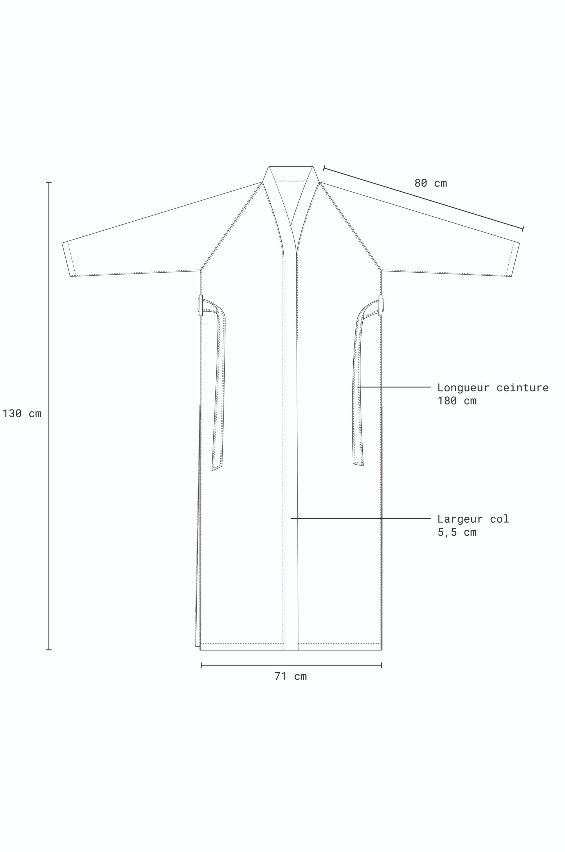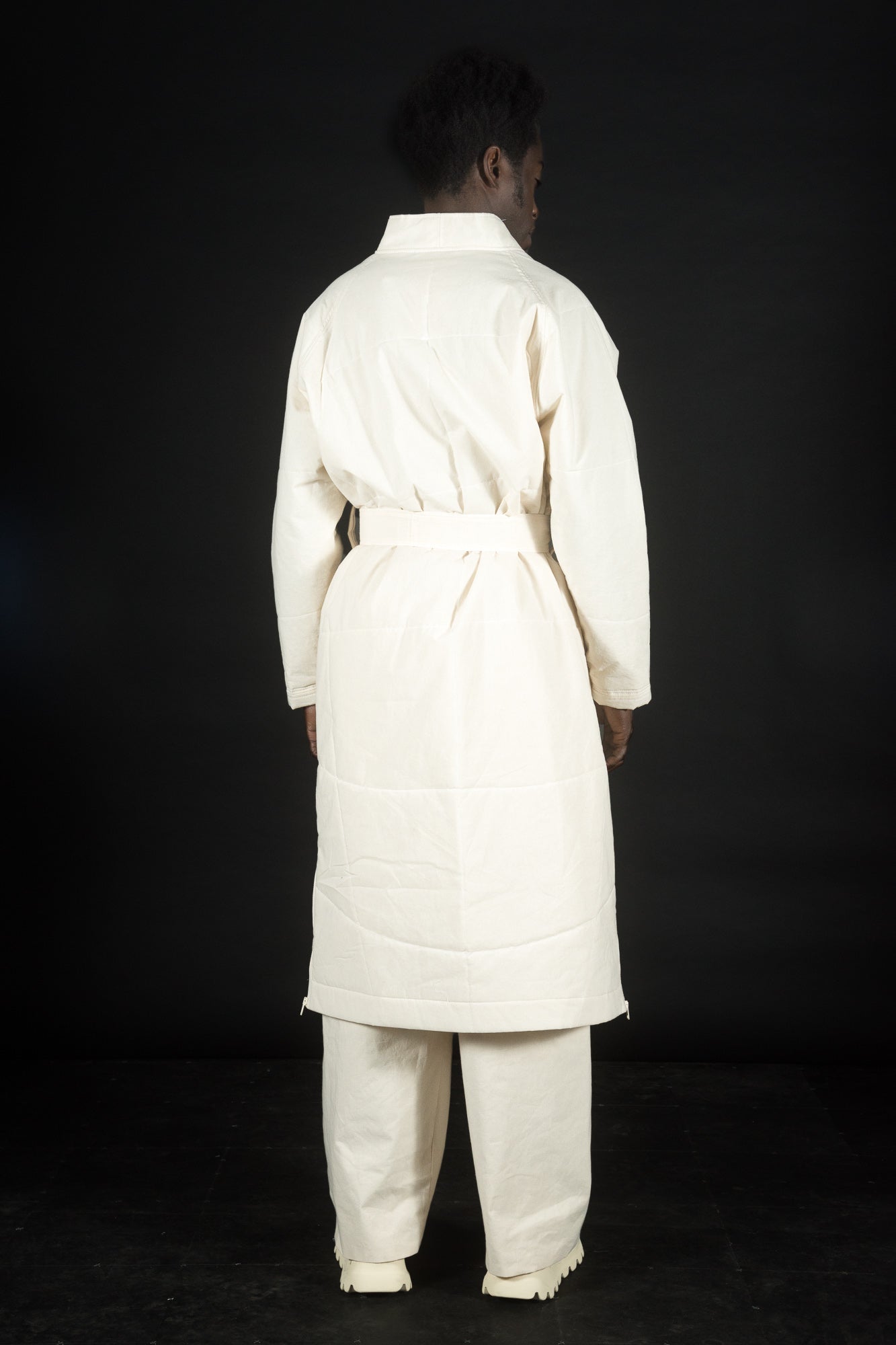 Ce Kimono s’inspire des combinaisons d'astronautes. Il est entièrement matelassé et doublé à la main en toile de coton. Les lignes de matelassage représentent les axes verticaux et horizontaux de la planète Terre. Il possède une ceinture qui peut se nouer de différentes manières. Des zips sur les côtés lui confèrent une grande amplitude de mouvements et permettent de glisser les mains dans les poches d’un pantalon. Les manches sont doublées en satin pour un enfilage agréable.