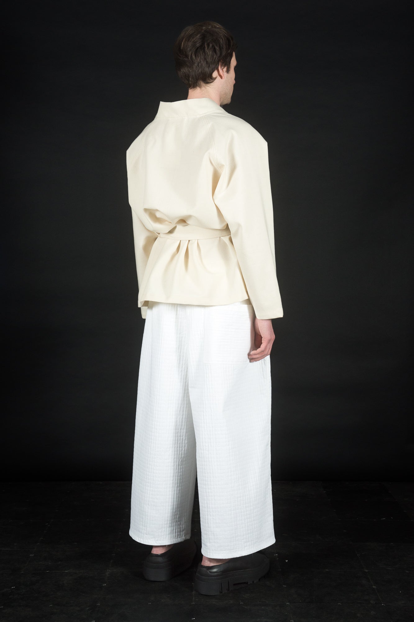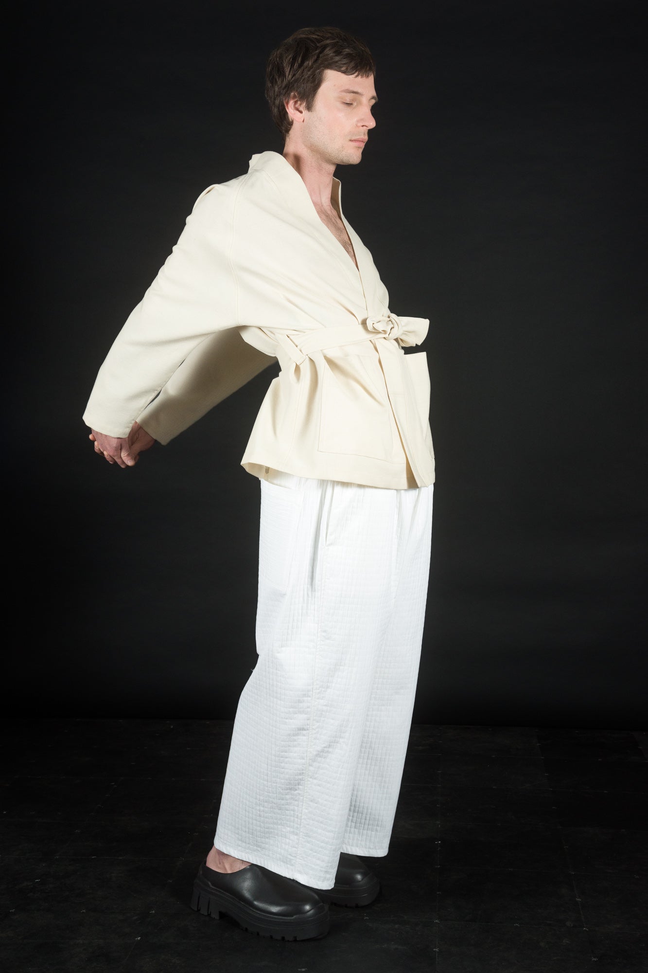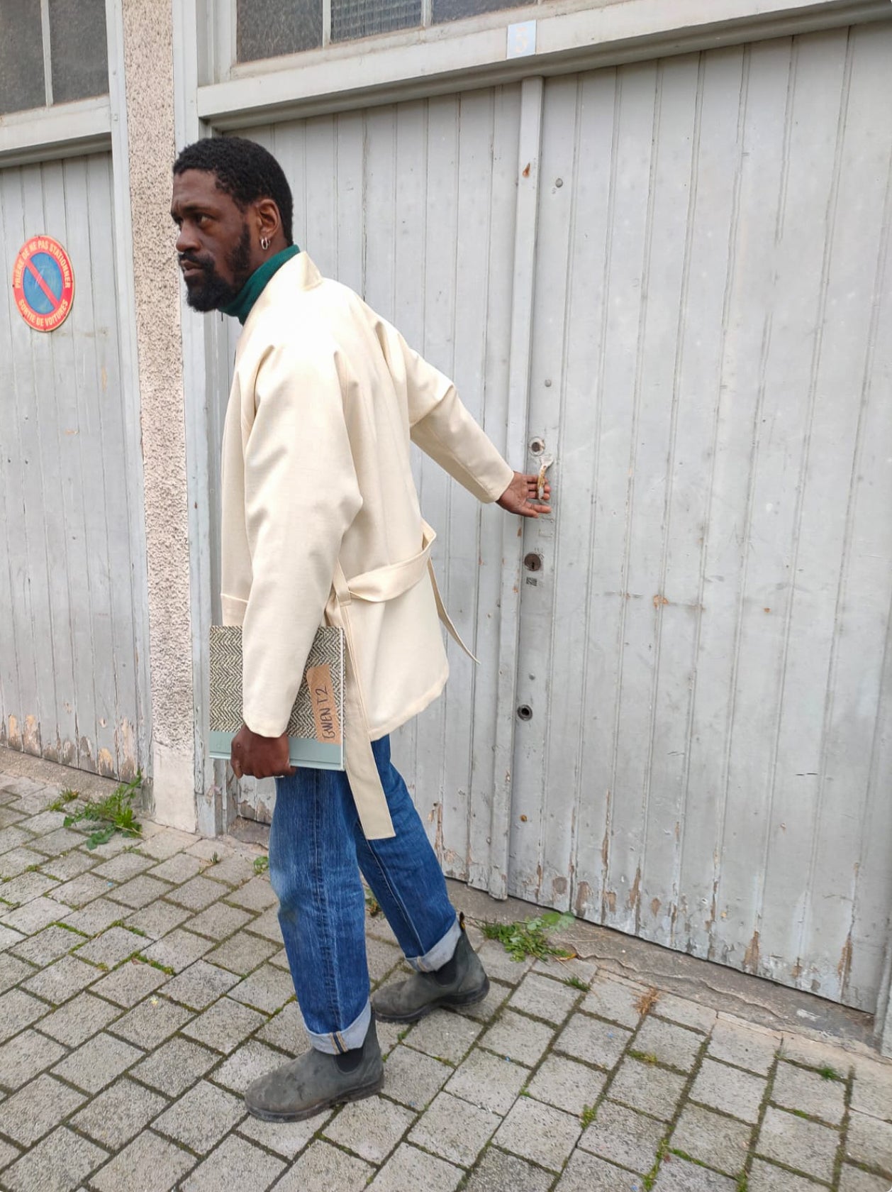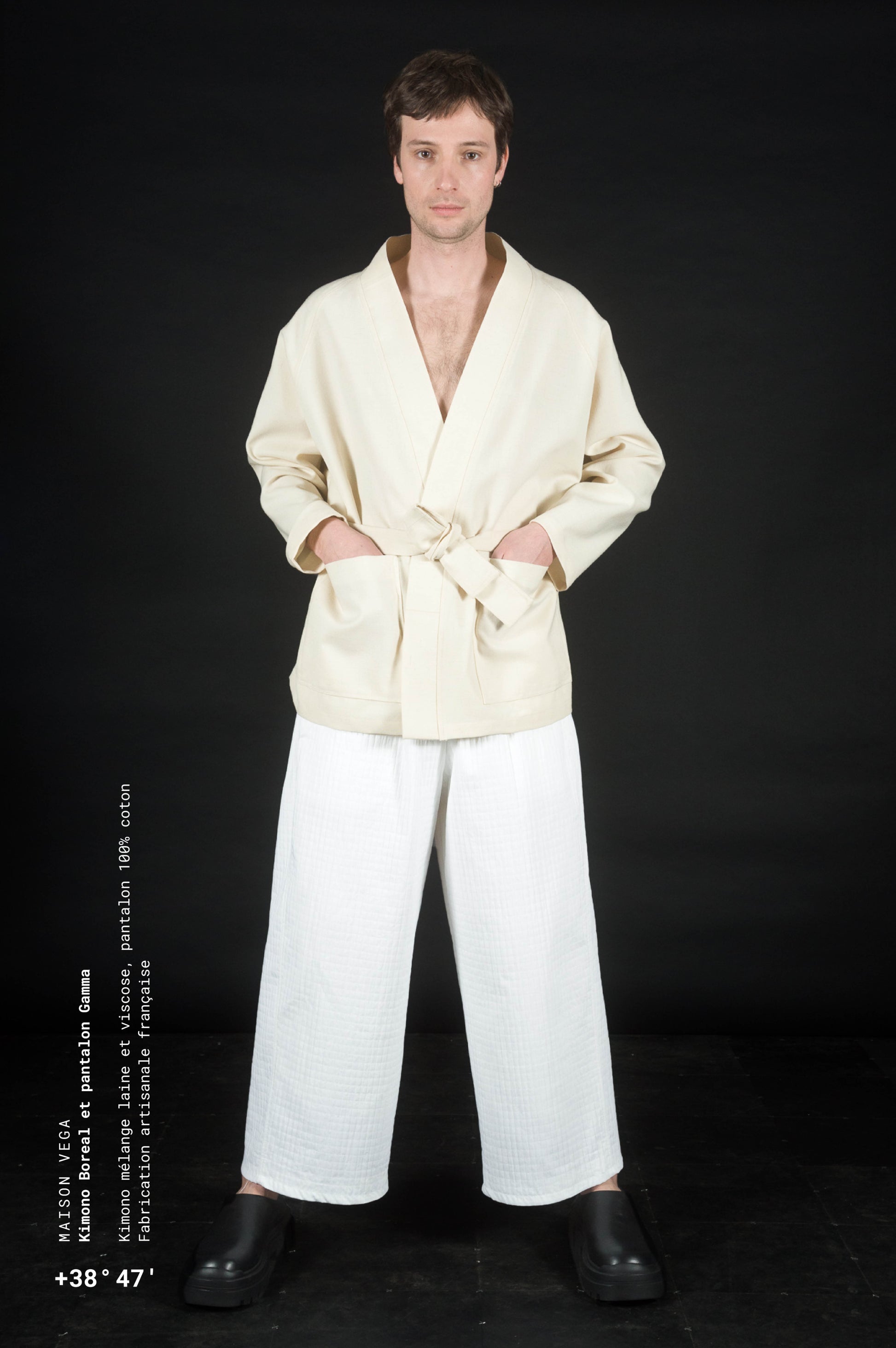 Cette pièce est un doux mélange entre le kimono et le bleu de travail en tissu laine/viscose de seconde main. Ce vêtement unisexe peut se porter comme une veste ou une sur-chemise.