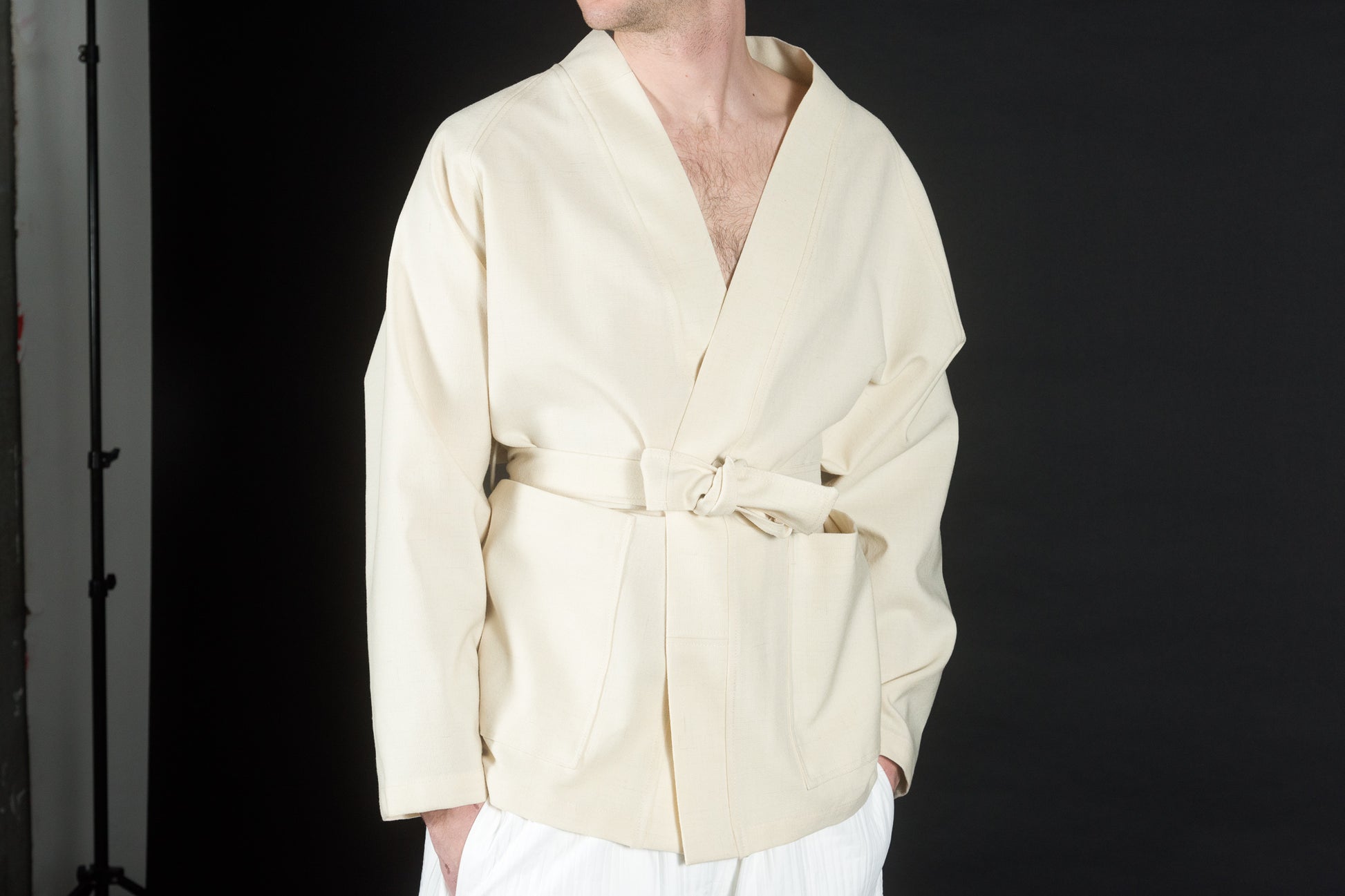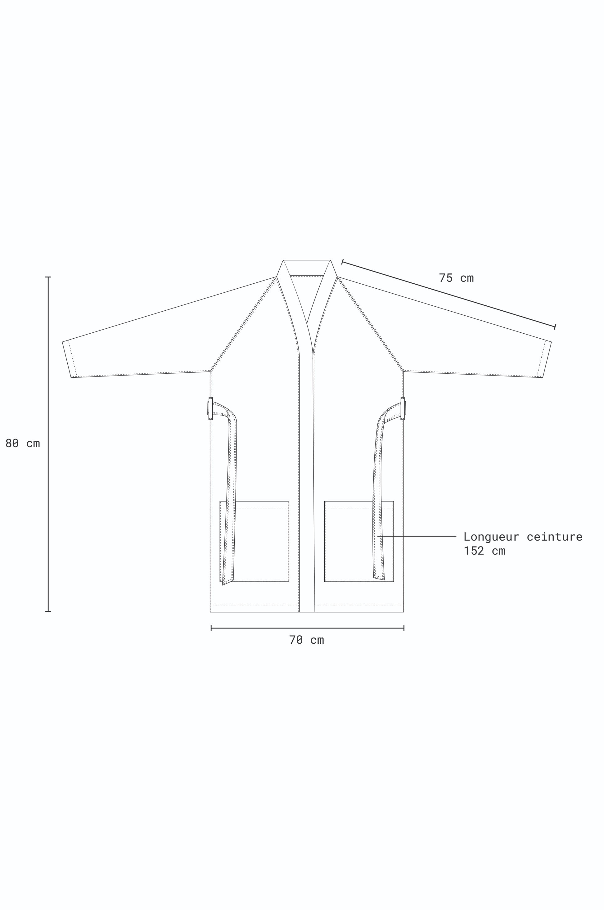 · Col kimono · Deux poches plaquées sur le devant · Deux passants côtés · Ceinture |